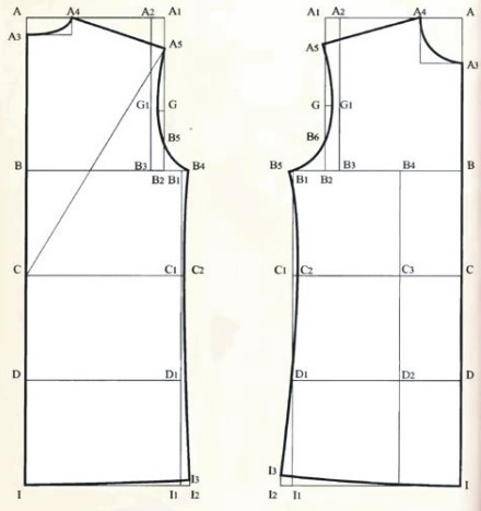 Построение спинки Строим прямой угол из точки А. АВ = высота проймы сзади (Впрз ) + прибавка. (Пример: 23 см + 3 см = 26 см.) АС = длина спины до талии (Дет) + прибавка. (Пример: 42 см + 2 см = 44 см.) CD = высота линии бедер (Вб). (Пример: 18 см. Подробнее...