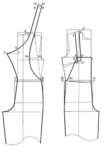 Полукомбинезон - это комбинезон с частично открытой верхней частью. Все построения выполняются на основе базовой конструкции комбинезона. Построение спинки АВ = линия талии комбинезона. АА 1 = ВВ1 = 1 см. А1О = 22см. DC = 6 см. Подробнее...